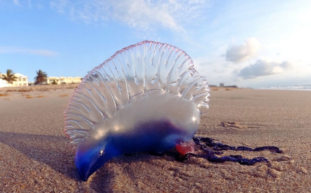 A parte maior visível da Caravela-portuguesa, chamada de flutuador translúcido, tem cerca de 10 cm, com tons de azul vibrante. Dentro há gases, como monóxido de carbono, que permitem que o organismo flutue. Mas é um organismo que se desloca pelas correntes e ventos. Em geral, fica em mar aberto, longe da costa, mas pode ser arrastada para as praias no Japão por ventos fortes e tufões, algumas vezes em grande número.