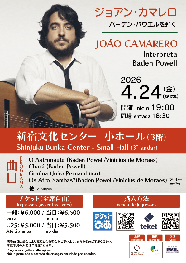 Realizado pela Kinoie Event, o concerto marca a apresentação única de João Camarero no Japão e oferece ao público japonês e à comunidade brasileira no país a oportunidade de presenciar um dos principais representantes da nova geração do violão brasileiro.